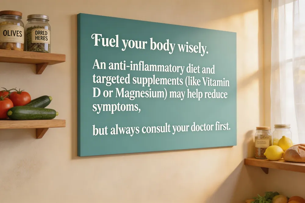 - An anti-inflammatory diet (e.g., Mediterranean) and eliminating common irritants like caffeine may help reduce symptoms; supplementation (e.g., Vitamin D, Magnesium) requires medical guidance.