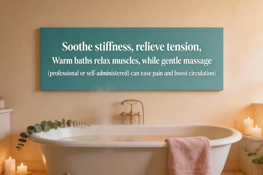 - Heat therapy (e.g., warm baths) relaxes muscles and soothes stiffness, while cold therapy can numb deep pain; both should be limited to 15-20 minutes per session.