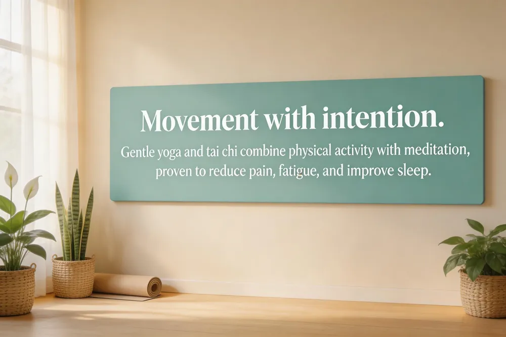 - Mind-body practices such as yoga and tai chi combine gentle movement with meditation, offering proven benefits for reducing pain, fatigue, and improving sleep.