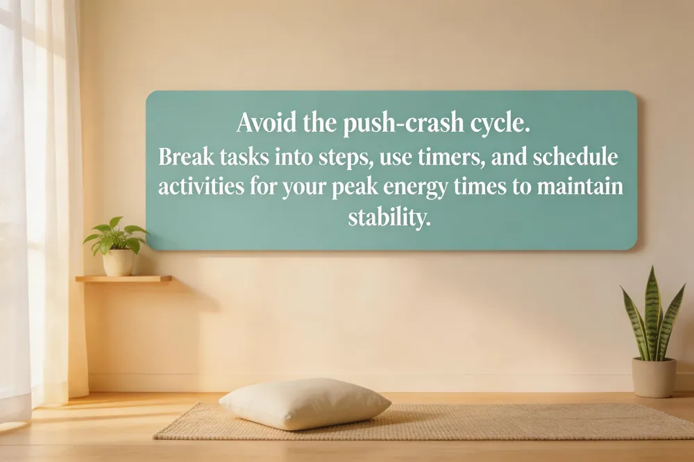 | Avoid Push-Crash | Maintain even activity level; don't overdo on good days | Plan daily activities based on morning energy assessment |