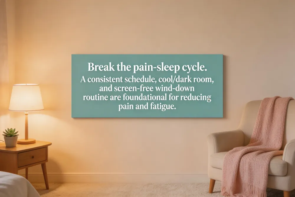 Start by setting a realistic bedtime that allows for at least 7-8 hours in bed. Use alarms for both bedtime and wake-up time if needed. This habit supports long-term stability in managing fatigue and pain levels.