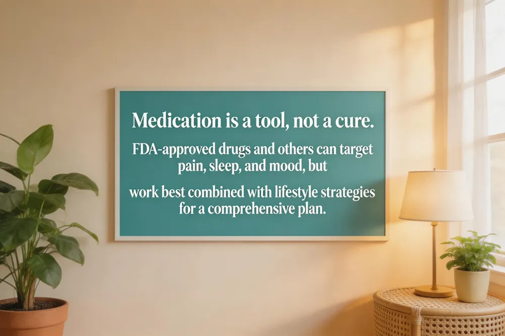 - FDA-approved medications (e.g., pregabalin, duloxetine) and others (e.g., amitriptyline) target pain, sleep, and mood but work best as part of a comprehensive, personalized plan.