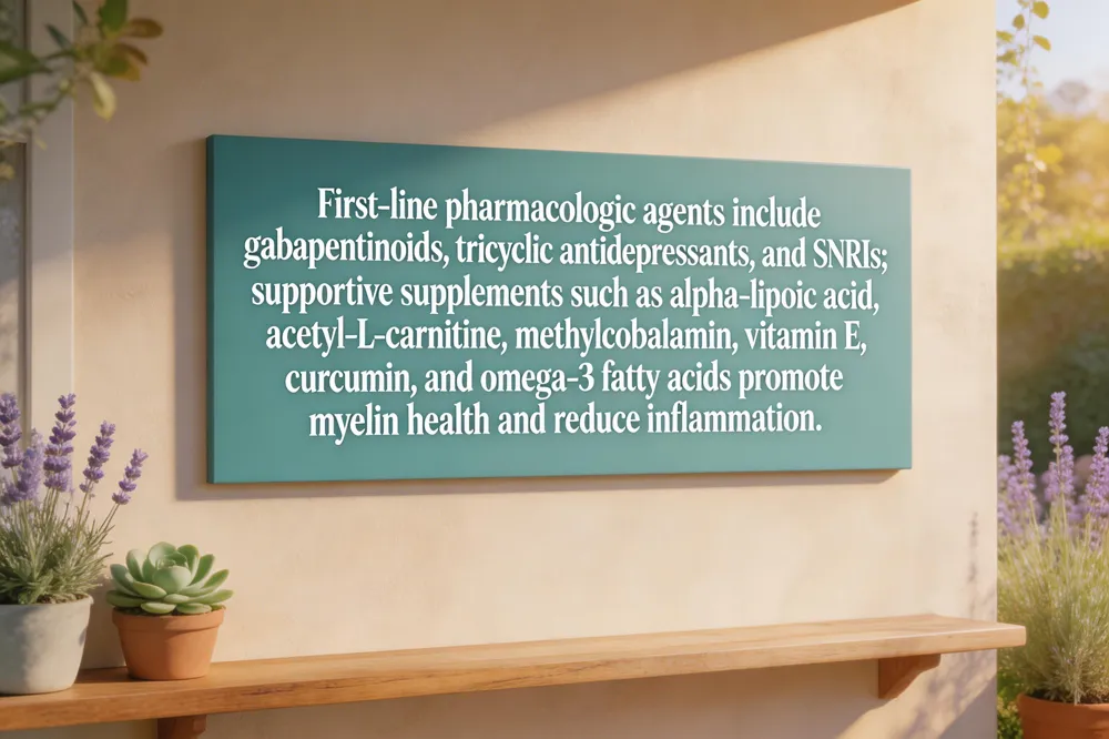 Nutrient‑based supplements that aid myelin health and regeneration include alpha‑lipoic acid, acetyl‑L‑carnitine, methylcobalamin (B12), and B‑complex vitamins. Antioxidants such as vitamin E, curcumin, melatonin, and omega‑3 fatty acids reduce inflammation and support Schwann‑cell activity. Adequate hydration and nerve‑friendly drinks—green tea, rich in catechins, or turmeric‑golden‑milk containing curcumin—provide anti‑inflammatory polyhydrolytes. These adjuncts should be coordinated with a pain‑medicine specialist to ensure safe dosing and avoid drug‑nutrient interactions.