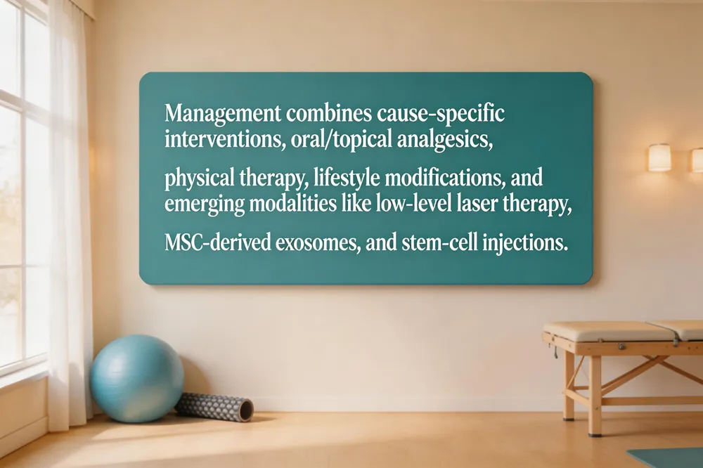 Emerging non‑pharmacologic options include low‑level laser therapy, targeted massage devices, and experimental cannabinoid‑nicotinic modulators that target pain pathways without opioid risks. Stem‑cell‑derived exosomes and adipose‑derived MSCs are under investigation for their neurotrophic and anti‑inflammatory effects, promising future disease‑modifying treatments.
