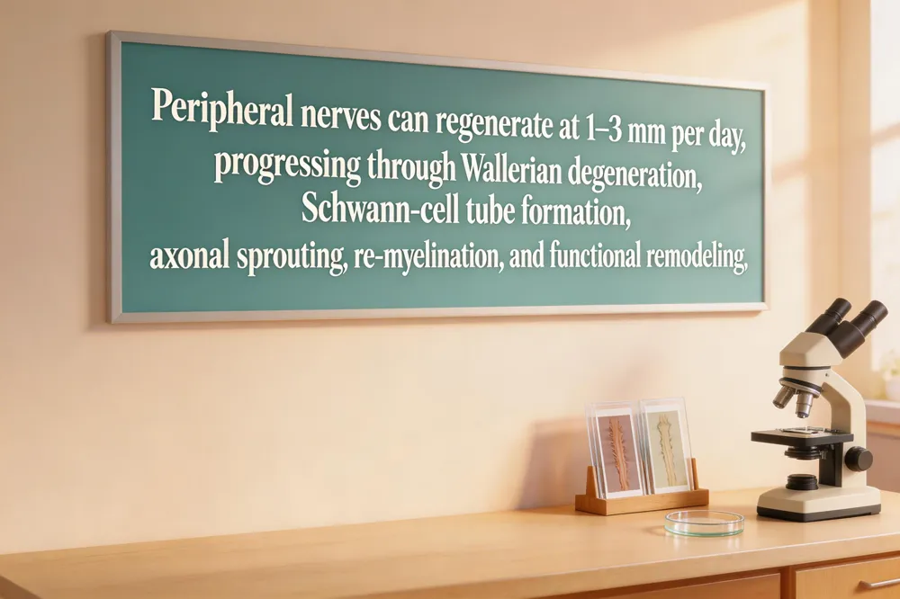 Peripheral nerves regenerate at an average pace of 1–3 mm per day (≈ an inch per month). The process begins with Wallerian degeneration, where the distal axon and myelin break down and macrophages clear debris. Schwann cells then proliferate, align into Bands of Büngner, and release neurotrophic factors (NGF, BDNF, GDNF, CNTF, NRG‑1) that guide axonal sprouts from the proximal stump toward their target organs. As axons extend, they re‑myelinate and re‑innervate muscles and sensory receptors, followed by remodeling and synaptic plasticity that fine‑tune function.