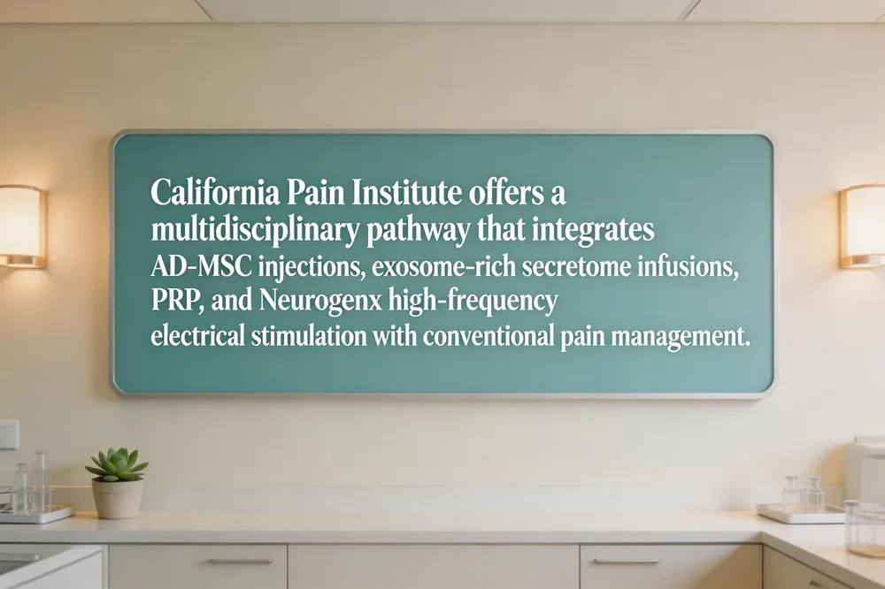 California Pain Institute (CPI) blends interventional pain expertise with regenerative therapies. After a detailed history, EMG, MR neurography, and blood work, patients enter a coordinated pathway that may include physical therapy, lifestyle counseling, and targeted pharmacology before advancing to biologic treatments.