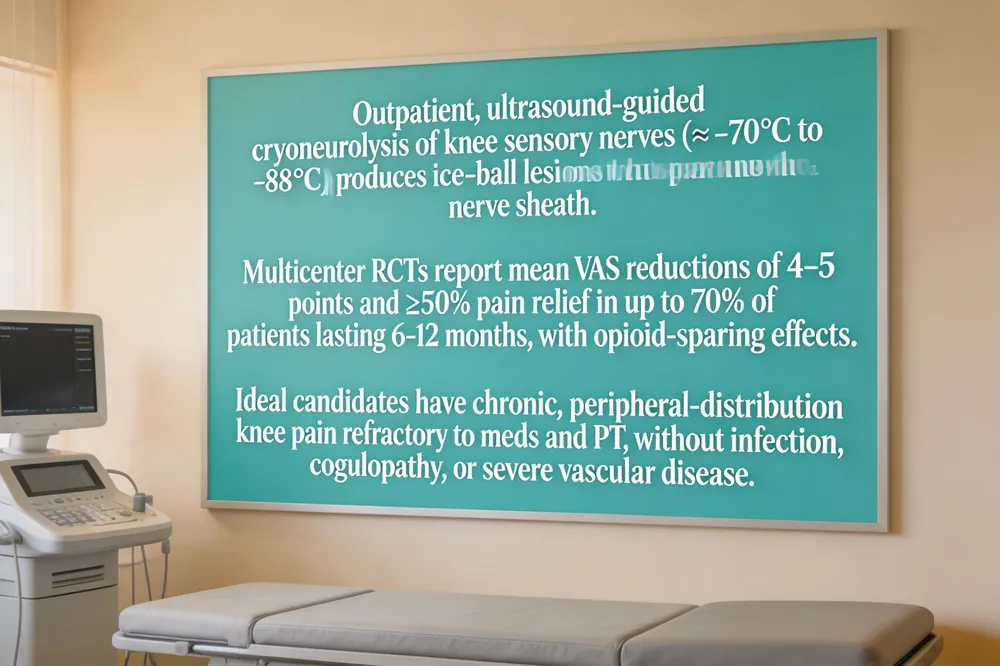Cryoneurolysis treats knee pain by applying extreme cold (≈ ‑70 °C to ‑88 °C) to specific sensory nerves around the joint, temporarily halting pain‑signal transmission. The outpatient procedure is performed under local anesthesia with ultrasound guidance using a thin cryoprobe that creates a precise ice‑ball lesion while preserving the nerve sheath. In knee osteoarthritis, multicenter RCTs and retrospective series have shown mean VAS reductions of 4–5 points and up to 70 % of patients achieving ≥50 % pain relief lasting 6–12 months, with concurrent opioid‑sparing effects. Ideal candidates are adults with chronic knee pain localized to a peripheral nerve distribution, refractory to pharmacologic and physical therapy measures, and without active infection, bleeding diathesis, or severe peripheral vascular disease. Because axonal regeneration proceeds at 0.5–2 mm per day, sensation gradually returns, allowing repeat treatments if needed. Cryoneurolysis is FDA‑cleared, minimally invasive, and offers a drug‑free alternative for patients seeking durable, reversible analgesia.