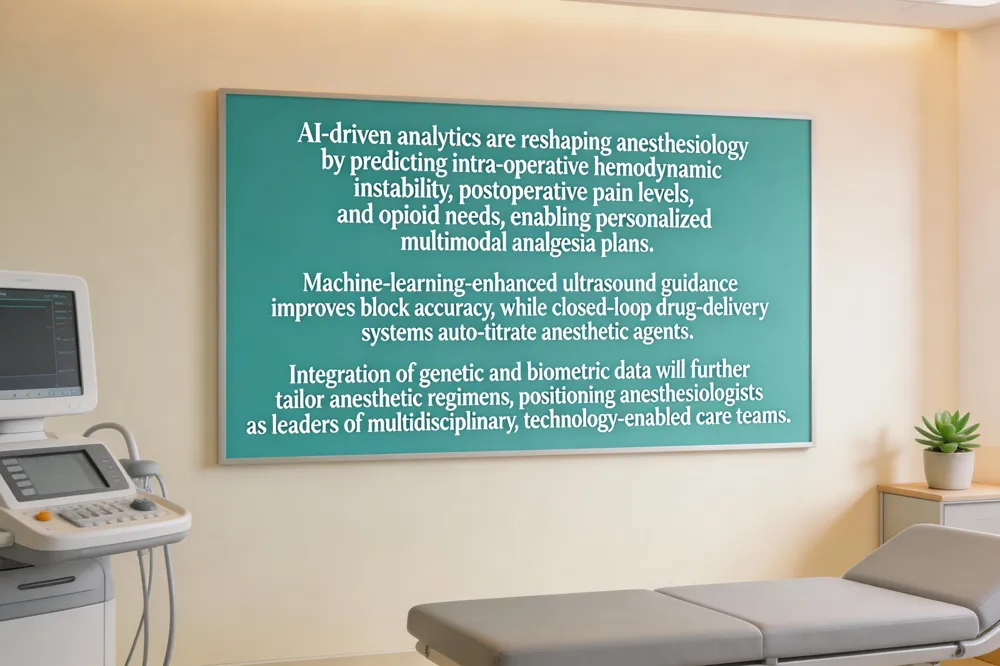 Artificial intelligence is rapidly reshaping anesthesiology by continuously analyzing intra‑operative physiological data to predict hemodynamic instability and adjust drug dosing in real time. Machine‑learning models can forecast postoperative pain levels and opioid requirements, enabling clinicians to craft personalized multimodal analgesia plans before discharge. AI‑driven image‑guidance systems overlay anatomical landmarks on ultrasound, improving the accuracy of regional blocks and vascular access. Predictive analytics also provide early warnings of complications such as hypotension or hypoxia, giving anesthesiologists a vital window for proactive intervention. The future of anesthesia will be defined by these advanced technologies and collaborative care models. Closed‑loop drug‑delivery platforms will automatically titrate anesthetic agents, reducing human error and enhancing safety. Personalized anesthetic regimens, informed by genetic profiles and continuous biometric data, will tailor drug selection and dosage to each patient. Anesthesiologists will increasingly lead multidisciplinary teams, integrating anesthesia into broader population‑health initiatives while maintaining the human touch essential for compassionate care.