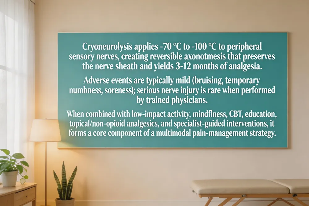 Cryoneurolysis works by applying extreme cold (‑70 °C to ‑100 °C) to a peripheral sensory nerve, creating a reversible axonotmesis that disrupts pain signal conduction while preserving the nerve sheath. This allows natural regeneration over weeks to months and provides analgesia lasting 3‑12 months. The safety profile is favorable: most adverse events are mild, including transient bruising, temporary numbness, and soreness at the probe site; rare complications such as skin discoloration, prolonged numbness, or brief motor weakness resolve with time, and permanent nerve injury is exceedingly uncommon when performed by trained physicians.