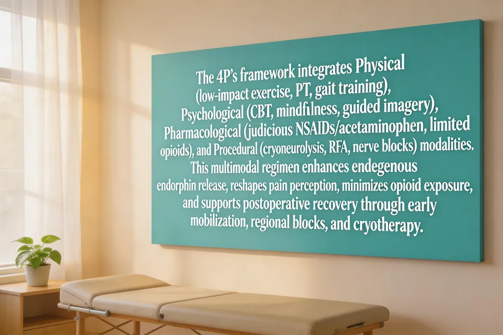 Physical therapy is cornerstone: low‑impact exercise, stretching, and gait training strengthen muscles, improve range‑of‑motion, and trigger endogenous endorphins. Psychological interventions such as cognitive‑behavioral therapy, mindfulness meditation, and guided imagery reframe pain perception and reduce stress‑related tension. Pharmacological considerations focus on adjuncts (NSAIDs, acetaminophen) used judiciously, reserving opioids for breakthrough pain and tapering promptly. Procedural options include nerve‑targeted cryoneurolysis (cryoneurolysis), radiofrequency ablation, and ultrasound‑guided nerve blocks, offering long‑lasting analgesia without permanent damage. Post‑operative pain control benefits from a multimodal regimen—acetaminophen, NSAIDs, regional blocks, early mobilization, and cryotherapy—to minimize opioid reliance. Dr. Kerr specializes in neuropathy, fibromyalgia, sciatica, chronic headache, and back‑pain syndromes, integrating the 4 P’s (Physical, Psychological, Pharmacological, Procedural) into individualized, non‑medication‑focused treatment plans.