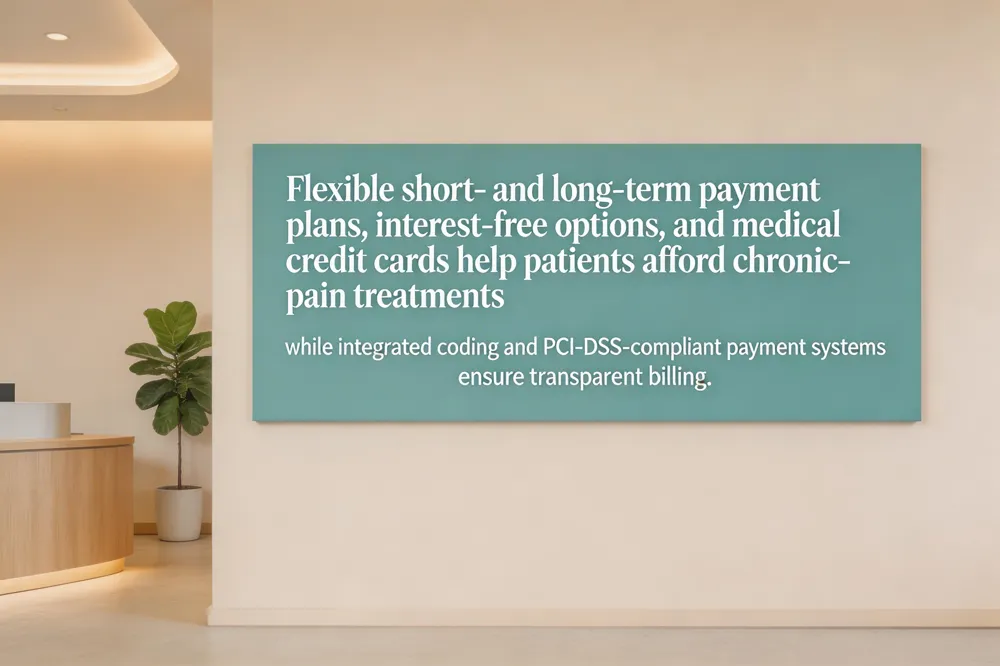 Payment plans for chronic‑pain care can range from short‑term (30‑90 days) to extended (3‑12 months, and in some cases up to 24 months) depending on the clinic’s policy, the patient’s credit profile, and any financial‑assistance programs. Many providers offer interest‑free or low‑interest options; for example, provider‑sponsored plans (e.g., Mayo Clinic) and medical credit cards such as CareCredit give 0 % promotional rates when the balance is paid within the agreed period, while third‑party lenders like Cherry or Alphaeon Credit may provide low‑interest terms (5‑15 % APR) for longer horizons. Billing for chronic‑pain services relies on specific CPT codes: office visits (99201‑99215), trigger‑point injections (20552‑20557), spinal injections (62321‑62328), physical‑therapy modalities (97010‑97035), and neurostimulation procedures (63650‑63688). Providers must document diagnosis, procedure details, and decision‑making to support claim submission. Reimbursement trends are moving toward value‑based models—bundled episodes, capitation, and ACOs—while telehealth and remote‑monitoring codes expand revenue streams. Clinics now use secure, integrated payment systems (PCI‑DSS compliant) that accept credit cards, HSA/FSA, and digital wallets, offering transparent fees and real‑time patient portals for balance tracking. This blend of flexible financing, accurate coding, and modern payment infrastructure helps patients access needed pain‑management treatments without undue financial strain.