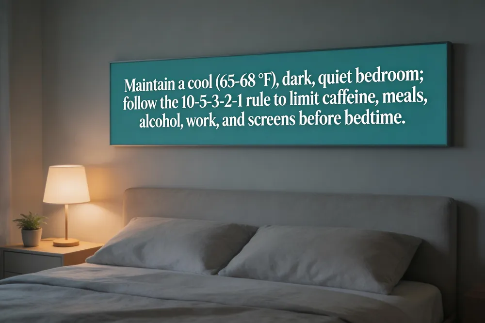 The 10‑5‑3‑2‑1 rule offers a simple, staged approach to evening habits: ten hours before bedtime avoid caffeine; five hours before bedtime skip large meals or sugary snacks; three hours before bedtime stop alcohol; two hours before bedtime finish work or stimulating activities; one hour before bedtime turn off screens and dim lights. This staggered cut‑off helps stabilize the circadian rhythm and eases the transition to sleep, especially for chronic‑pain sufferers.
