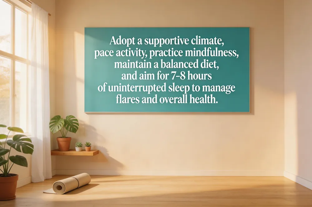 Consistently keep a bedtime and wake‑time, create a cool, dark, quiet bedroom, use a supportive mattress, limit caffeine and evening screens, enjoy a pre‑sleep routine such as a warm bath or gentle stretching, and incorporate exercise and mindfulness meditation. Talk with your rheumatologist or sleep specialist to tailor treatments and rule out apnea or RLS. Over time, better sleep lowers pain sensitivity, reduces fatigue, and supports health.