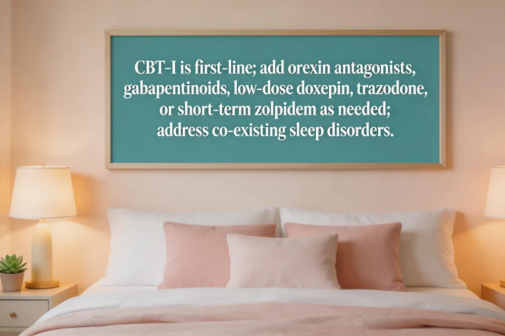 A multifaceted approach is essential for fibromyalgia‑related insomnia. First, good sleep hygiene—consistent bedtime, cool dark bedroom, limiting caffeine and screens—sets the foundation. Cognitive‑behavioral therapy for insomnia (CBT‑I) is the first‑line, evidence‑based treatment; it restructures maladaptive thoughts, reduces nighttime rumination, and improves sleep latency without medication side effects. When CBT‑I alone is insufficient, pharmacologic options are added. Dual orexin‑receptor antagonists such as suvorexant (Dayvigo) are often preferred because they enhance both sleep onset and maintenance while avoiding the dependence risk of traditional sedatives. Gabapentinoids (pregabalin, gabapentin) can simultaneously relieve restless‑leg symptoms and chronic pain, improving sleep continuity. Low‑dose doxepin or trazodone may be used for sleep‑maintenance insomnia, and short‑term zolpidem can aid rapid sleep onset when absolutely needed. Over‑the‑counter melatonin can help regulate circadian rhythm but should be physician‑guided. Because co‑existing disorders (obstructive sleep apnea, restless‑leg syndrome) are common, a polysomnography sleep study is recommended to identify and treat these contributors, thereby breaking the pain‑sleep vicious cycle.