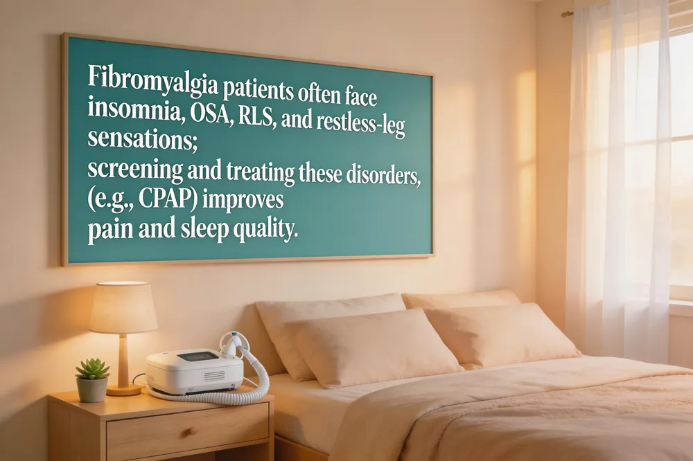 People with fibromyalgia often experience non‑restorative sleep, waking up feeling unrefreshed despite a full night in bed. Insomnia is common, with difficulty falling asleep, staying asleep, or frequent nighttime awakenings that fragment sleep. Polysomnography shows reduced slow‑wave (deep) sleep and increased wakefulness during NREM stages, leading to heightened daytime fatigue, low energy, and a lower pain threshold. Restless‑leg sensations, periodic limb movements, and sleep‑related breathing disorders such as obstructive sleep apnea (OSA) further disrupt rest. Up to 90 % of patients report shallow, fragmented sleep, and co‑existing disorders—OSA, restless‑leg syndrome (RLS), and chronic insomnia—must be screened for. OSA is especially prevalent; treating it with CPAP can lower pain intensity and systemic inflammation. Some patients also describe sleep‑paralysis‑like episodes, likely arising from abnormal REM‑NREM transitions and heightened nighttime anxiety. Management is multifaceted: consistent sleep‑wake times, a cool dark bedroom, regular low‑impact exercise, mindfulness or progressive muscle relaxation, and first‑line CBT‑I. When needed, targeted therapies such as CPAP for OSA or medication for RLS may be added, breaking the pain‑sleep cycle and improving overall quality of life.