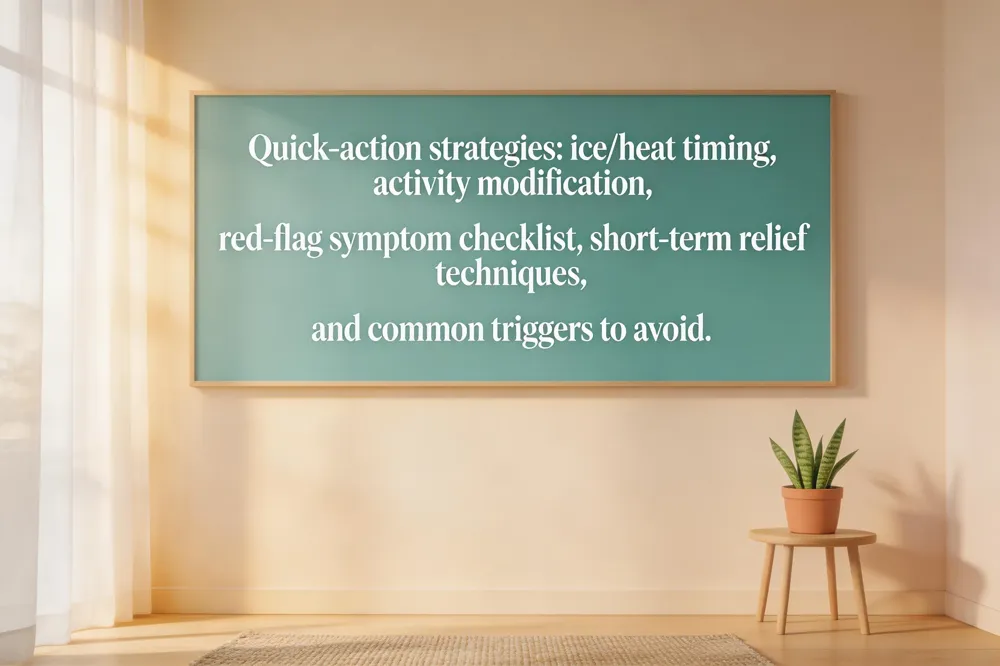 Short‑term relief techniques: For rapid relief, shift to a pain‑free position, apply a cold pack for 15 seconds, perform a quick glute‑contraction, then stand and do a brief hamstring stretch before walking a few steps.