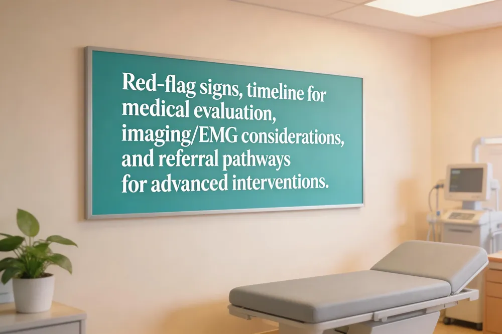 Red‑flag signs such as sudden loss of bladder or bowel control, severe bilateral leg weakness, numbness around the perineal area, or rapidly worsening pain may indicate cauda equina syndrome and require immediate emergency evaluation. If sciatica pain persists beyond four to six weeks of home care—despite regular gentle stretching, heat or ice therapy, and over‑the‑counter NSAIDs—schedule a visit with your primary‑care physician or pain‑medicine specialist. The clinician will review your history, perform a focused neurological exam, and may order imaging (MRI or CT) or electromyography to identify a herniated disc, spinal stenosis, or other structural cause. In the later stages of sciatica, constant severe pain, progressive weakness, or persistent numbness can signal permanent nerve damage; urgent referral to a spine specialist for epidural steroid injections, radiofrequency ablation, or surgical decompression may be needed. Early, multidisciplinary management—including targeted physiotherapy, appropriate medication, and lifestyle modifications—helps prevent escalation and restores function.