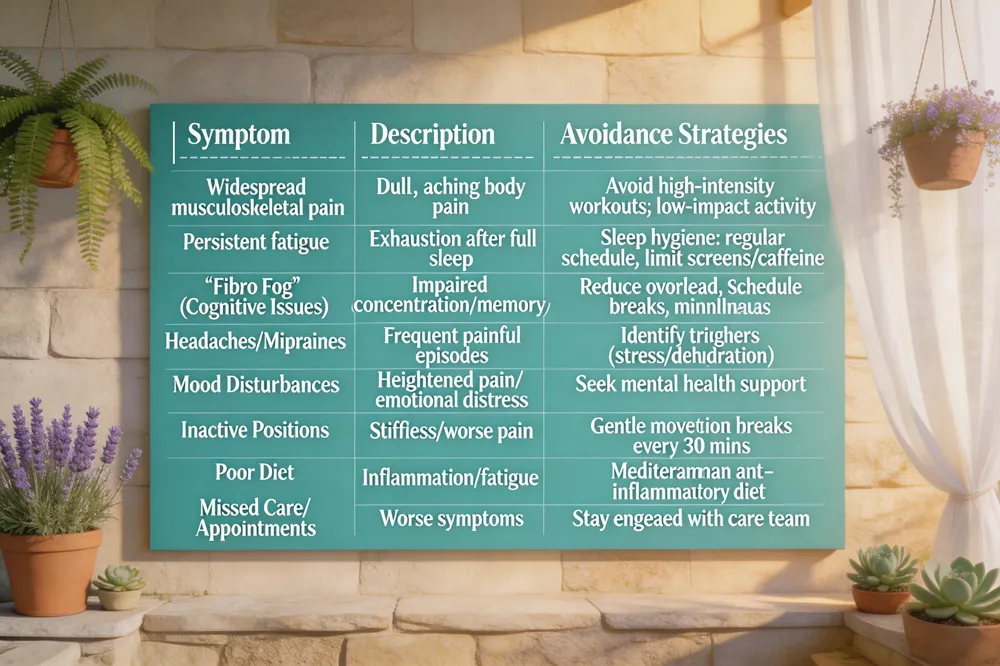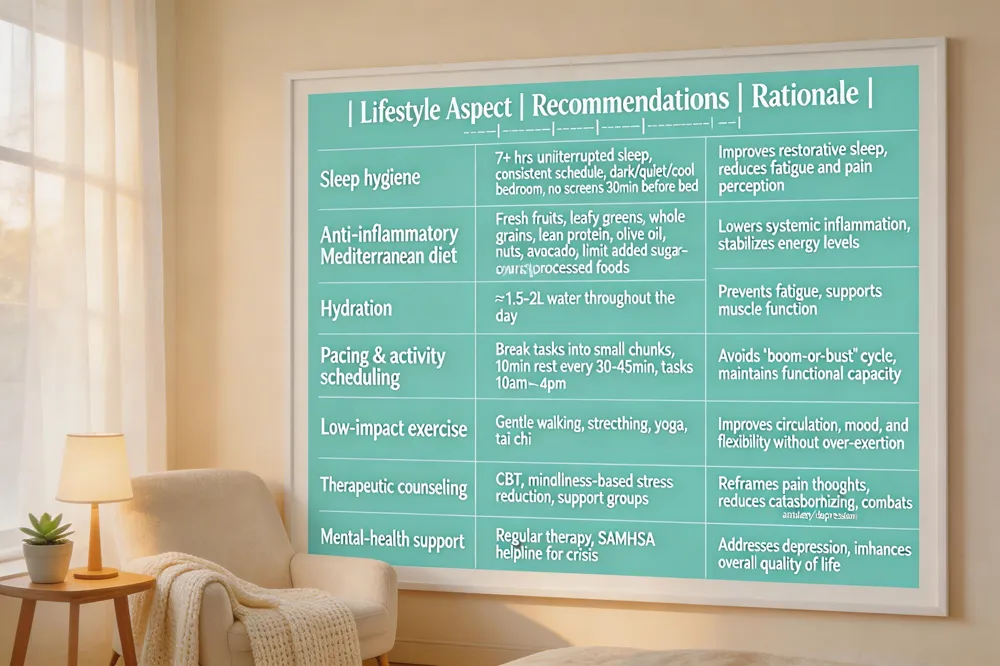 A nutrient‑dense, Mediterranean‑style eating plan can lessen systemic inflammation and support energy levels. Emphasize fresh fruits, leafy vegetables, whole grains, lean proteins (fish, poultry, legumes), and healthy fats from olive oil, nuts, and avocado. Reduce added sugars, processed foods, gluten, and MSG, which some patients find aggravate pain and brain fog. Stay well‑hydrated—drink plenty of water throughout the day—to combat fatigue and improve muscle function.
