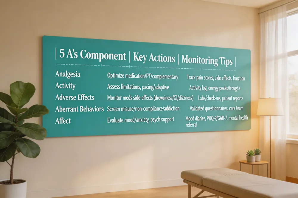 A systematic approach to chronic pain helps patients and clinicians stay organized, proactive, and compassionate. The 5 A’s of chronic‑pain care—Analgesia, Activity, Adverse effects, Aberrant behaviors, and Affect—provide a concise checklist. Analgesia focuses on achieving meaningful pain relief through medication, physical therapy, or complementary modalities. Activity evaluates how pain limits daily tasks and encourages pacing or adaptive strategies. Adverse effects involve vigilant monitoring for side‑effects from analgesics or other therapies. Aberrant behaviors identify signs of misuse, non‑compliance, or addiction risk. Affect addresses the emotional toll, including anxiety, depression, and mood fluctuations.