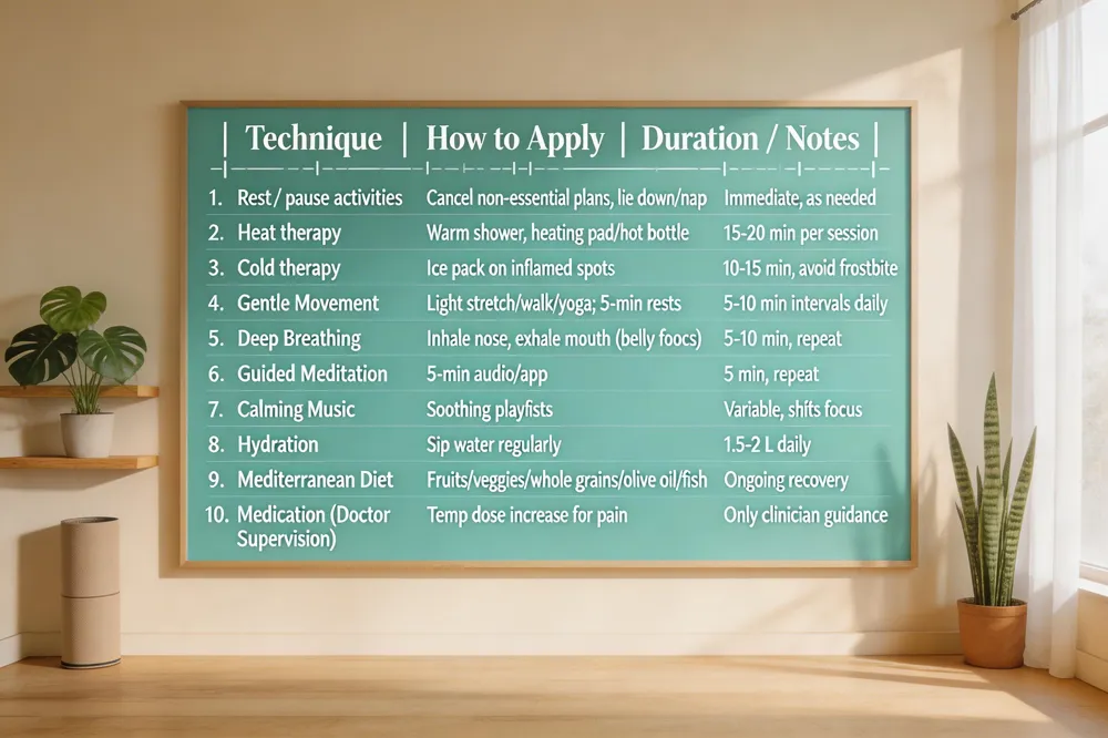 Rest and pausing are the first line of defense when a flare strikes. Allowing yourself to stop activities, cancel non‑essential plans, and nap or lie down removes the “fight‑or‑flight” drive that fuels pain. Heat and cold therapy can be applied immediately: a warm shower, heating pad, or hot water bottle relaxes tight muscles and improves circulation, while a brief ice pack can numb sharp, inflamed spots. Choose the modality that feels most soothing and limit each session to 15‑20 minutes.