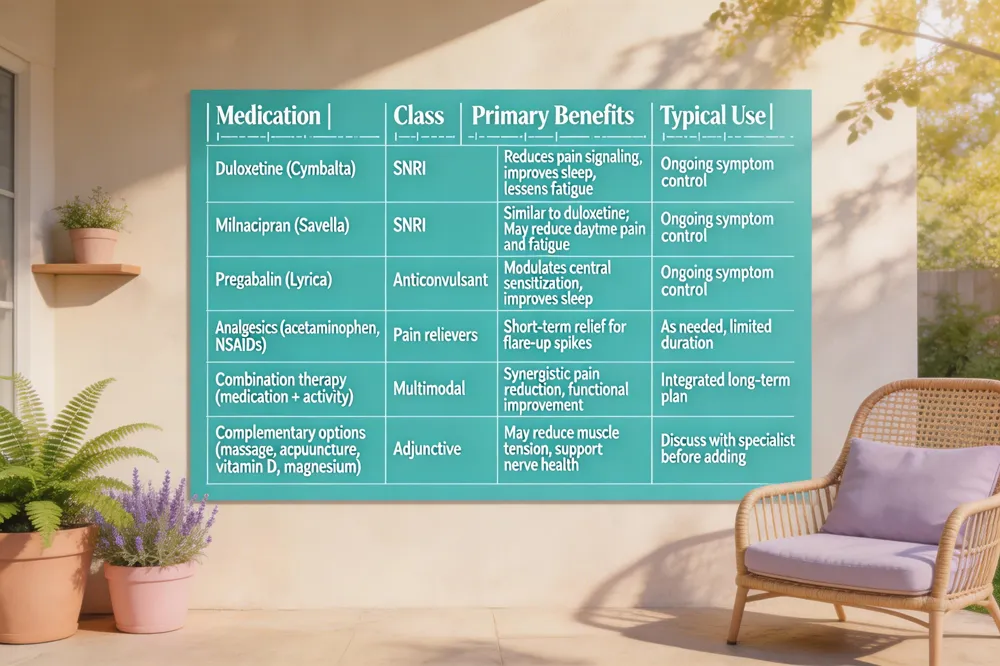 FDA‑approved drug classes for fibromyalgia include serotonin‑norepinephrine reuptake inhibitors (SNRIs) such as duloxetine and milnacipran, and the anticonvulsant pregabalin. These agents target central sensitization, decreasing pain signaling, improving sleep continuity, and reducing daytime fatigue. They are typically prescribed for ongoing symptom control, while short‑term use of analgesics or a brief increase in medication dose may be employed during an acute flare when pain spikes exceed baseline levels.