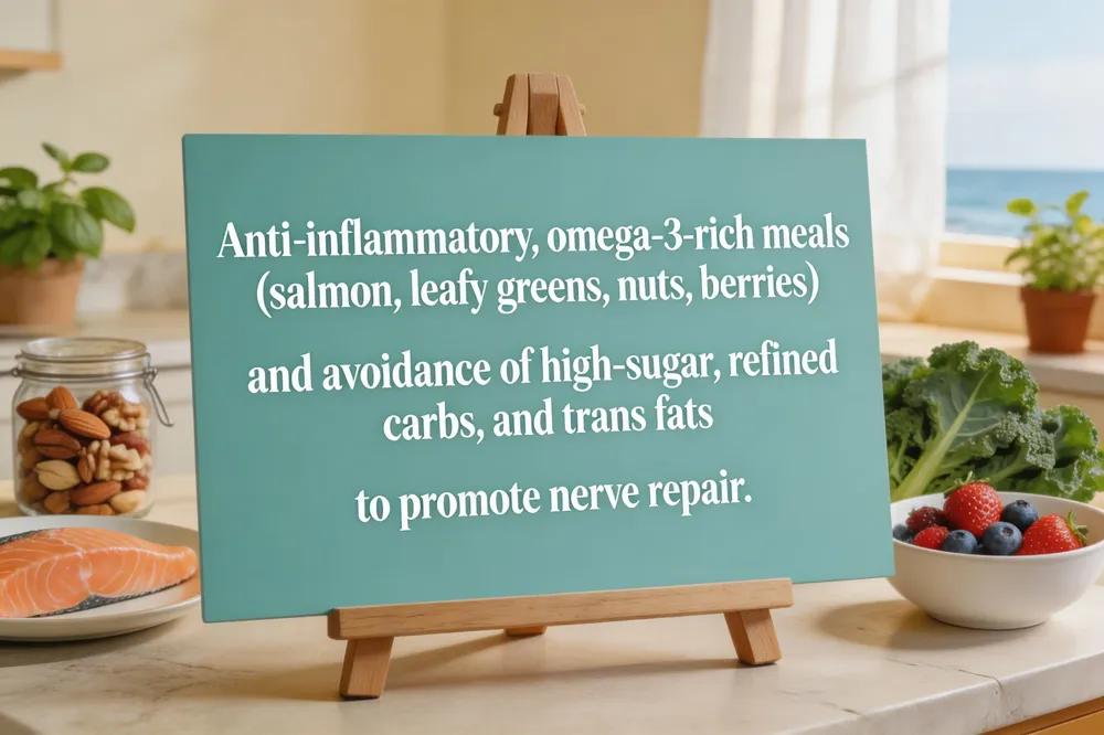 Anti‑inflammatory, nerve‑supporting meals should include omega‑3s, antioxidants, and B‑vitamins. Simple options: grilled salmon over a quinoa‑spinach salad, roasted sweet‑potato‑lentil curry, berry‑almond smoothie with chia and flax, avocado toast topped with walnuts, and a kale‑pineapple smoothie. Pre‑cut vegetables reduce hand strain; these dishes protect nerves and may lessen pain.