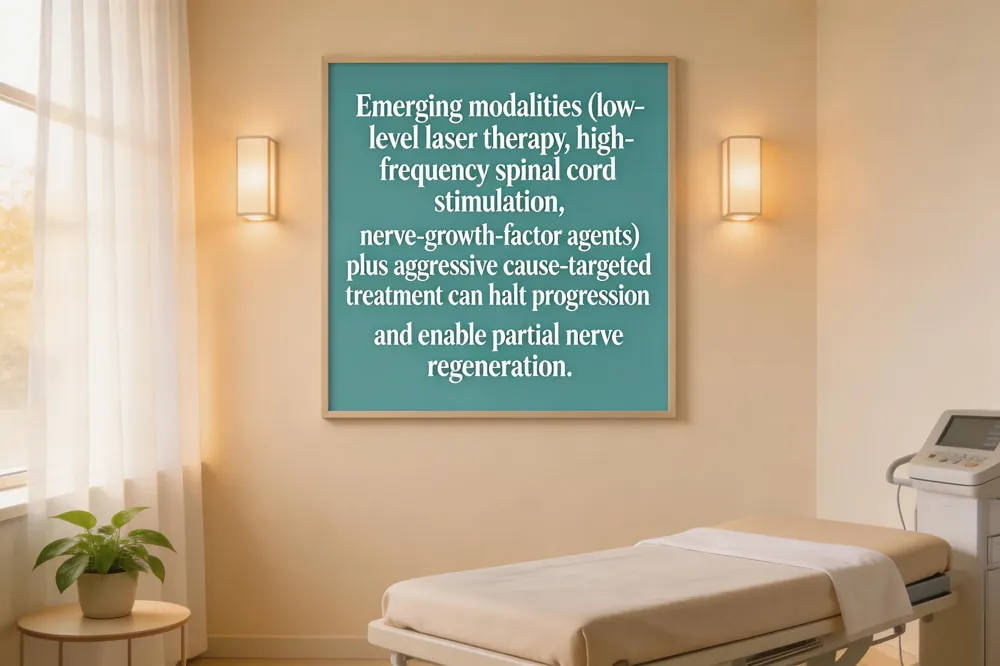 Peripheral neuropathy is generally chronic, and while a complete cure is rare, stabilization and partial recovery are achievable when the underlying cause—such as uncontrolled diabetes, vitamin deficiencies, medication toxicity, or autoimmune disease—is identified early and treated. Tight blood‑sugar control, B‑vitamin supplementation, and removal of offending agents can halt nerve damage and, in some cases, promote regeneration of small fibers, offering measurable symptom relief. Emerging foot‑specific treatments add another layer of hope: low‑level laser therapy, high‑frequency spinal cord stimulation, and lidocaine‑release patches provide localized pain reduction and may stimulate healing. Investigational disease‑modifying agents, including nerve‑growth‑factor mimetics, are progressing through clinical trials. Integrating these modalities with proven lifestyle strategies—regular moderate exercise, anti‑inflammatory nutrition, smoking cessation, and proper foot care—creates a comprehensive, multidisciplinary plan. Although full reversal is uncommon, a timely, combined approach can often stop deterioration, restore significant function, and improve quality of life.