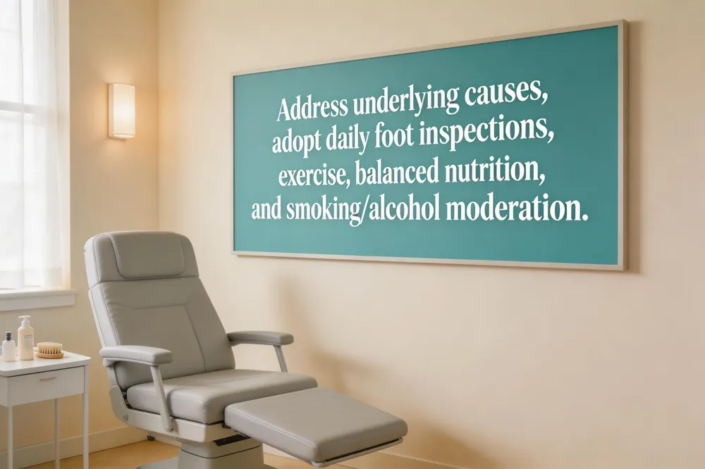 Lifestyle measures are essential: daily foot inspections, regular low‑impact exercise (walking, swimming, tai chi), a balanced diet rich in fruits, vegetables, whole grains, and lean protein, smoking cessation, limited alcohol, and tight blood‑sugar control for diabetics. These steps help prevent ulceration, maintain nerve health, and slow disease progression.