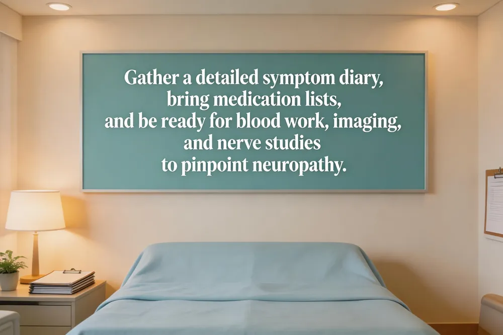 A thorough medical history and focused neurological exam are the foundation of peripheral neuropathy evaluation. Clinicians then order targeted blood work (glucose, vitamin B12, thyroid, inflammatory markers), imaging such as MRI/CT, and nerve conduction studies (EMG, NCS) to locate and characterize nerve damage. When the diagnosis remains unclear, a skin or nerve biopsy may be performed for definitive pathology. Patients should arrive with a symptom diary documenting onset, intensity, triggers, and daily functional impact, and bring a list of current medications, supplements, and specific questions for the specialist.