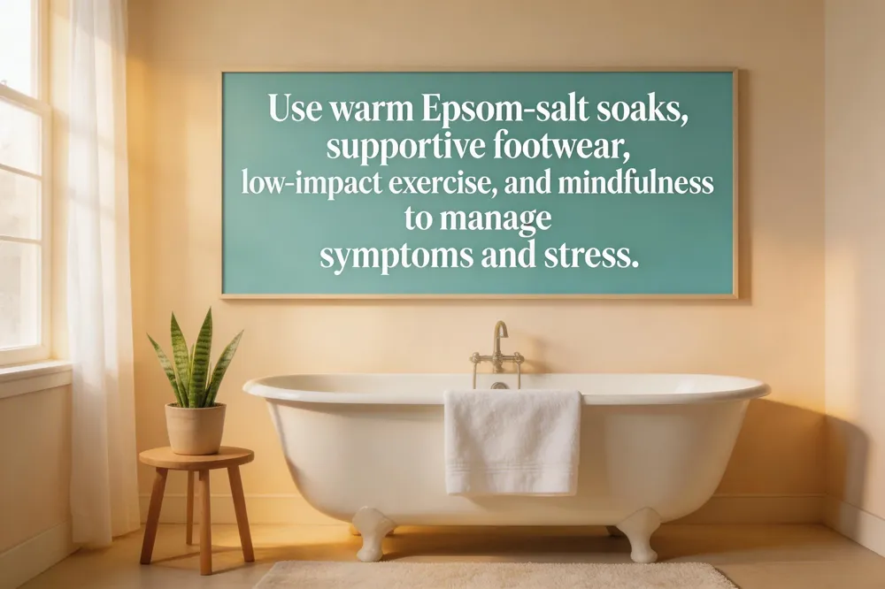 Warm Epsom‑salt foot soaks, brief cold packs, low‑impact walking or swimming, cushioned shoes, and OTC lidocaine or menthol creams provide temporary relief.