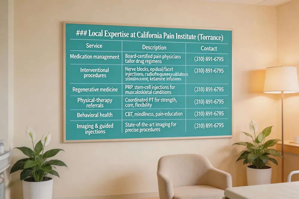 Pain management Torrance, CA? The California Pain Institute offers comprehensive pain‑management services right in Torrance, CA, with board‑certified physicians who develop personalized treatment plans for chronic and acute pain. Their multidisciplinary approach includes medication management, physical‑therapy referrals and a full suite of interventional procedures such as nerve blocks, epidural and facet‑joint injections, radiofrequency ablation, spinal‑cord stimulation, intrathecal pain pumps, ketamine infusions and regenerative‑medicine options like PRP. By coordinating care with physical, occupational and mental‑health specialists, the clinic aims to restore function and improve overall quality of life. Patients can schedule a consultation at the institute’s Torrance office, where state‑of‑the‑art imaging and guided‑injection techniques are available. Call (310) 891‑6795 or visit the clinic’s website to learn more and book an appointment.