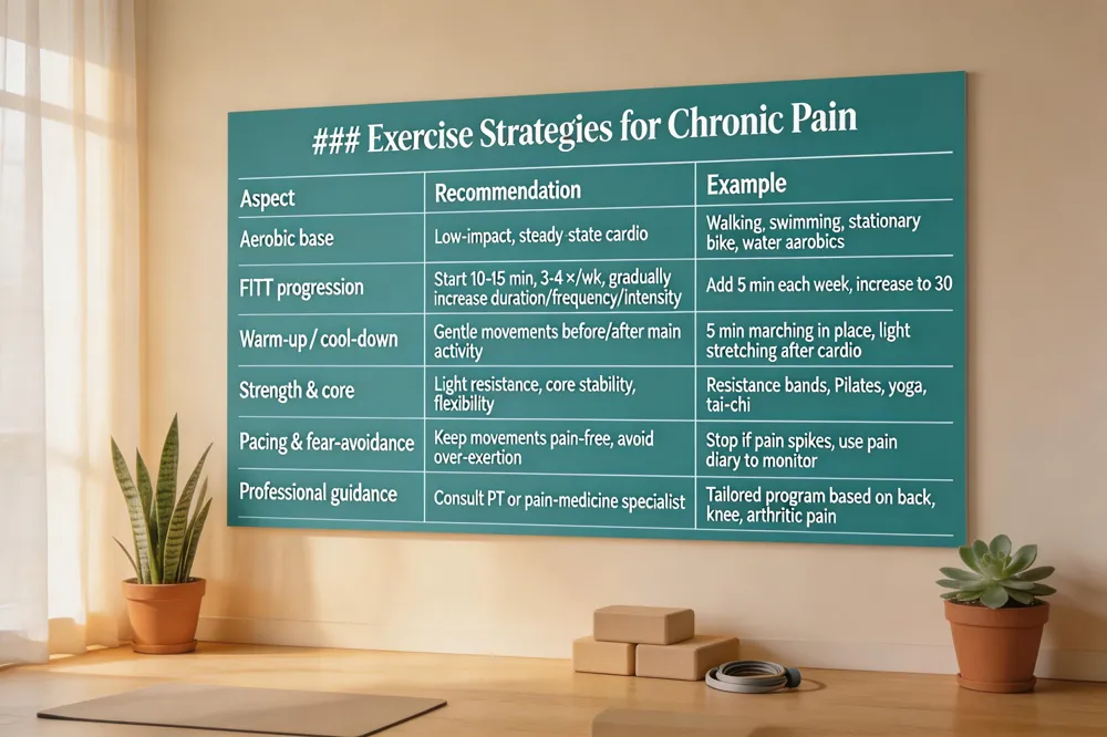 How to exercise with chronic pain? Start with low‑impact aerobic activity, keep movements pain‑free, add light strength and flexibility work, and aim for consistent, moderate sessions. Consult a pain‑medicine specialist or physical therapist to tailor the plan.
