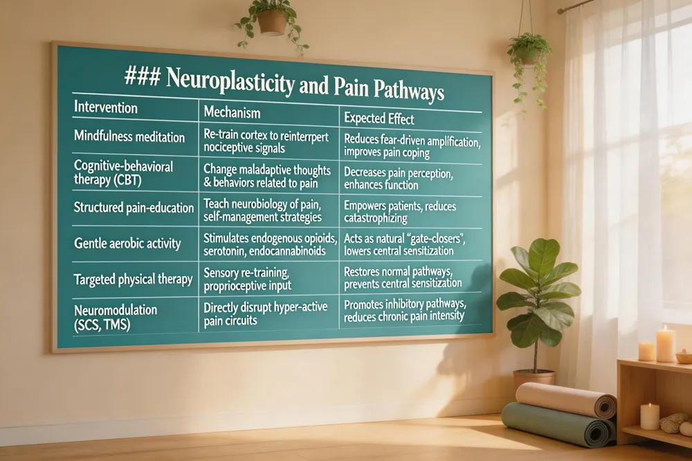 | Chronic pain persists when the nervous system becomes “stuck” in a hyper‑alert state, but neuroplasticity offers a route to reset those pathways. Brain‑based interventions such as mindfulness meditation, cognitive‑behavioral therapy (CBT) and structured pain‑education programs teach the cortex to reinterpret nociceptive signals, dampening fear‑driven amplification and fostering adaptive circuitry. Regular, gentle aerobic activity—walking, swimming, or low‑impact yoga—stimulates the release of endogenous opioids, serotonin and endocannabinoids, which act as natural ‘gate‑closers’ and shift immune signaling toward anti‑inflammatory cytokines. Targeted physical‑therapy programs provide sensory re‑training, restoring normal proprioceptive input, preventing central sensitization, and strengthening musculoskeletal support for joints and the spine. Neuromodulation technologies, including spinal‑cord stimulation and transcranial magnetic stimulation, directly disrupt hyper‑active pain circuits and promote the formation of new inhibitory pathways. Consistent practice of these strategies, combined with adequate sleep, balanced nutrition and stress‑management, enables the nervous system to “unlearn” chronic pain and adopt healthier processing patterns. By integrating brain‑focused therapies, graded exercise, and neuromodulation, patients can rewire pain pathways, reduce reliance on opioids, and transition to an active, fulfilling lifestyle. |