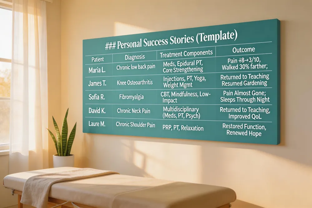Progress Timeline & Measured Outcomes: After 8 weeks, her numeric pain score fell from 8/10 to 3/10, she walked 30 % farther, and returned to classroom duties. A patient quote closes the story: “I finally feel like I can live again.”