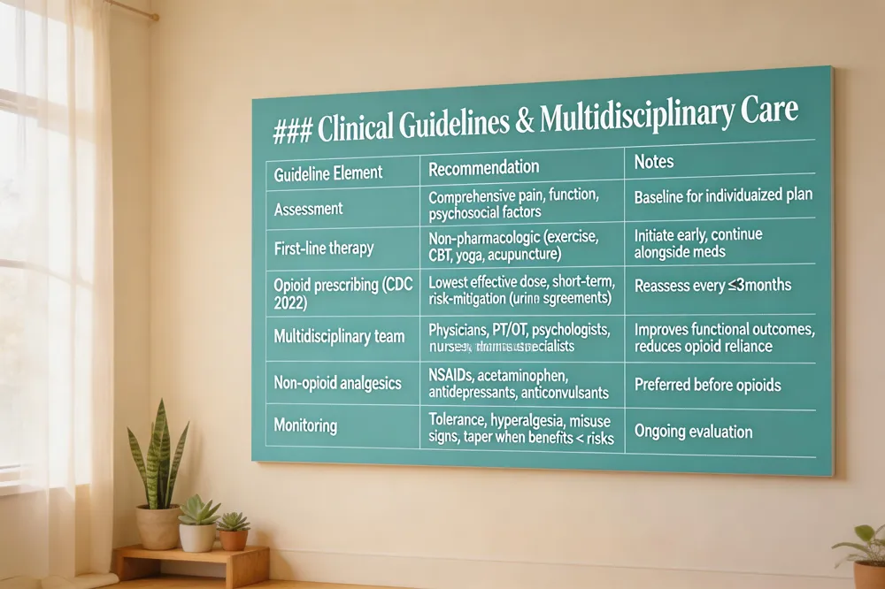 - Chronic pain management guidelines? They call for individualized, multimodal plans that integrate early non‑pharmacologic therapy, judicious opioid use, and ongoing functional reassessment.