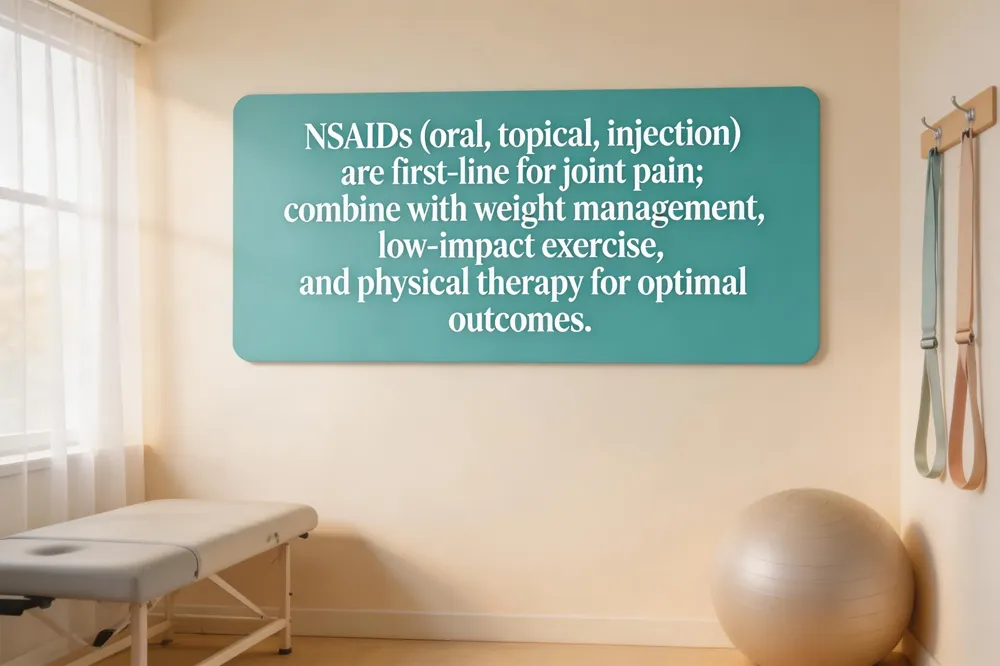 Non‑steroidal anti‑inflammatory drugs (NSAIDs) are the cornerstone for joint pain and stiffness. Over‑the‑counter ibuprofen and naproxen sodium are effective for mild‑to‑moderate osteoarthritis, while prescription agents such as diclofenac, meloxicam, and the COX‑2‑selective celecoxib provide stronger relief for persistent inflammation. Topical NSAID gels (e.g., diclofenac gel) and image‑guided intra‑articular injections deliver high local concentrations with minimal systemic exposure. Safety is paramount: NSAIDs increase gastrointestinal bleeding risk, can diminish renal function, and may raise cardiovascular events, especially in older adults or those with existing heart disease. To mitigate risks, take NSAIDs with food, use the lowest effective dose, and avoid concurrent use with anticoagulants unless directed by a clinician.