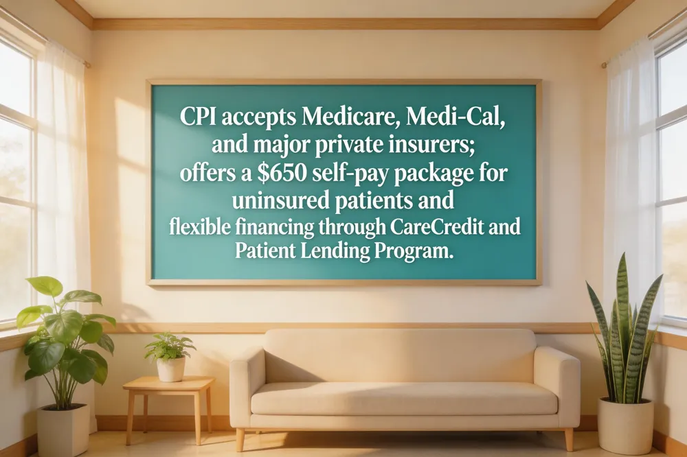For patients who are uninsured, under‑insured, or have high co‑pays, CPI offers a transparent self‑pay fee structure. The basic self‑pay option includes an initial office visit, a recommended in‑office procedure, and a follow‑up appointment for a one‑time fee of $650. This package provides a predictable cost for those who prefer to avoid insurance billing.