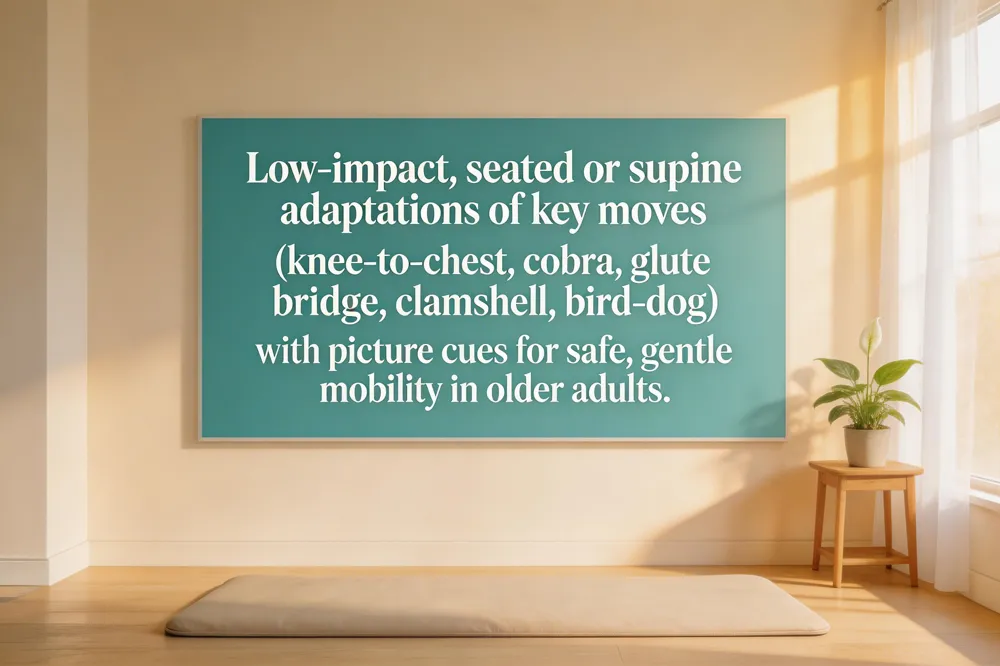 Modifications can be done seated or supine to accommodate limited mobility. For example, the Knee‑to‑Chest stretch can be performed while seated, pulling one knee toward the chest while keeping the opposite foot flat on the floor. The Cobra pose can be done lying on the stomach with the forearms on the mat, allowing a modest arch of the back without full weight‑bearing. The Glute Bridge may be performed with a small pillow under the lower back for extra support, while the Clamshell can be done lying on the side with a pillow between the knees. The Bird‑Dog can be simplified by keeping the lifted arm and leg close to the floor instead of fully extending.