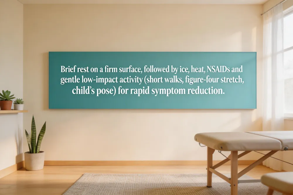 Immediate relief for sciatica pain – Stop the aggravating activity, lie on a firm surface, apply ice , then heat, and engage in brief walking or swimming. Use NSAIDs as directed; if pain persists or worsens, seek professional evaluation for possible injections or physical therapy.