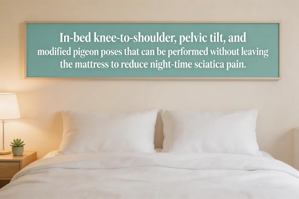 Sciatica exercises in bed can be performed without leaving the mattress, providing safe, gentle relief during the night. A knee‑to‑shoulder variation involves lying on your back, bending one knee and guiding it across the torso toward the opposite shoulder; hold for 30 seconds, then repeat on the other side. The pelvic‑and lumbar mobilization sequence starts with a pelvic tilt: gently flatten the lower back into the bed, hold a few seconds, then arch slightly; repeat 10‑12 times to promote spinal flexion. For hip opening, a modified pigeon pose is done on the side—bring the top knee toward the wrist while extending the opposite leg, then slowly fold forward over the stretched leg, holding 20‑30 seconds. Perform each movement slowly, breathe deeply, and discontinue if pain worsens. Consistent nightly practice can reduce nerve tension, improve mobility, and complement daytime physical‑therapy programs for sciatica management.