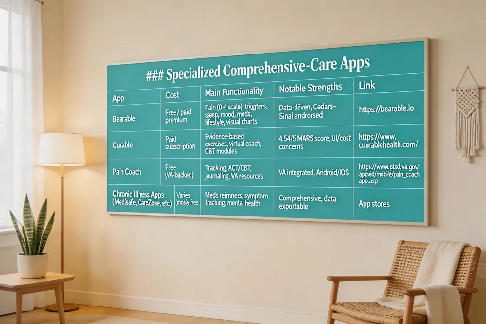 | Select tools that match your needs: free, high‑scoring apps such as Curable, PainScale‑Pain Diary and Coach, or SuperBetter offer guided meditations, CBT modules, and pain‑tracking dashboards, while Bearable and Manage My Pain provide exportable graphs for clinician review. Wearables (Apple Watch, Fitbit, or Visible band) add passive heart‑rate, activity, and sleep data that enrich self‑monitoring. |