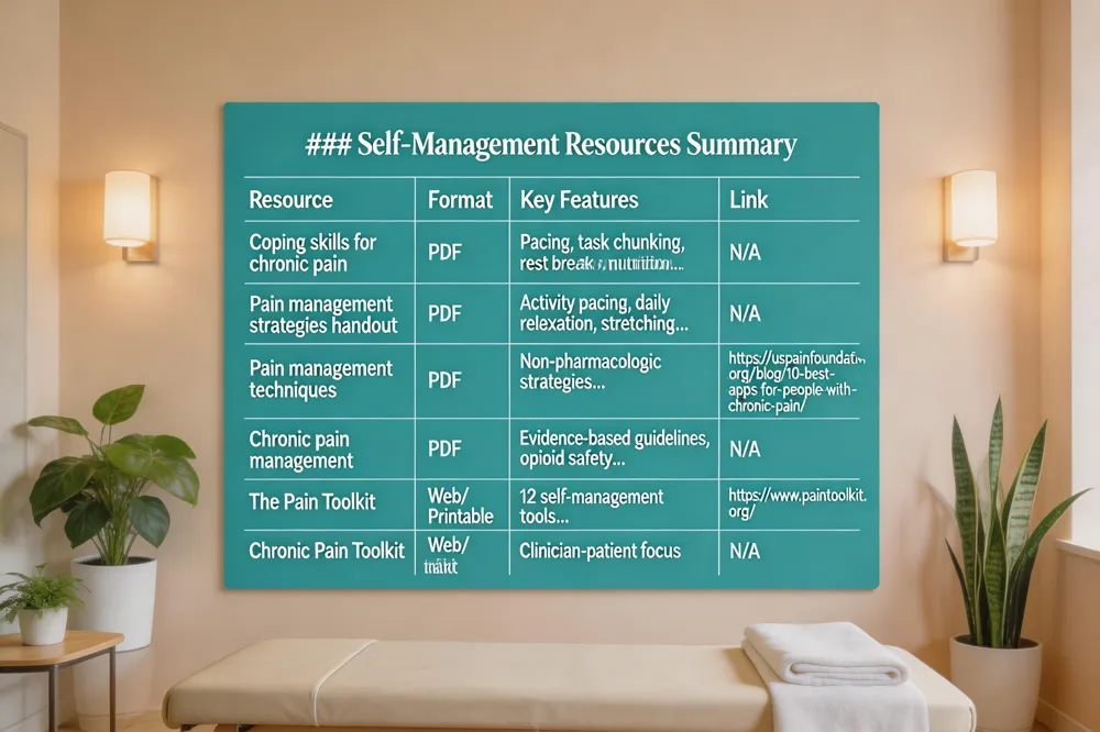 | Self‑management tools for chronic pain are essential complements to clinical care. Coping skills for chronic pain PDF provides a step‑by‑step plan that includes pacing activities, breaking tasks into smaller steps, regular rest breaks, hydration, balanced meals, and constipation monitoring. It also offers CBT exercises, relaxation training, mood‑tracking worksheets, and a "Pain Self‑Management Strategies Wheel" for tracking progress over time. |