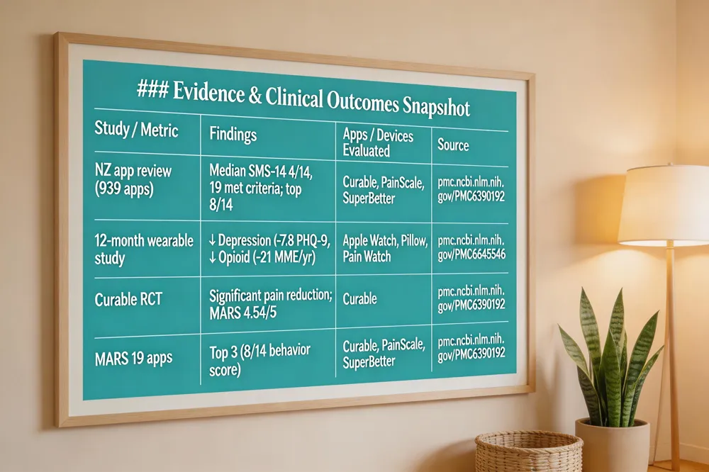 | Reviews find most apps include 2–15 behavior‑change techniques, especially mindfulness and CBT. In a New Zealand search of 939 apps, only 19 met criteria for persistent‑pain self‑management; they scored a median of 4/14 on the SMS‑14 checklist (range 1‑8). The top‑scoring apps—Curable, PainScale‑Pain Diary & Coach, and SuperBetter—reached 8/14 and were free, suggesting scalable options. A 12‑month study of wearable use (Apple Watch, Pillow, custom Pain Watch) showed significant reductions in depression (‑7.8 PHQ‑9) and opioid use (‑21 MME/year) when paired with a multidisciplinary program. Curable’s RCT confirmed efficacy and earned the highest MARS score (4.54/5) among 19 apps. |