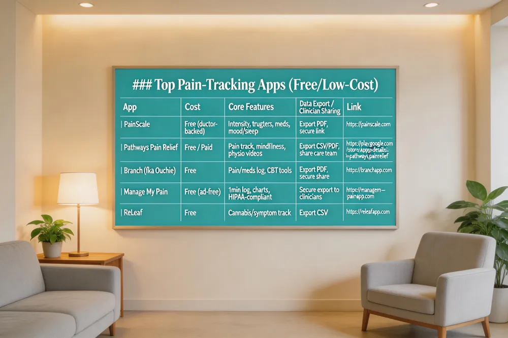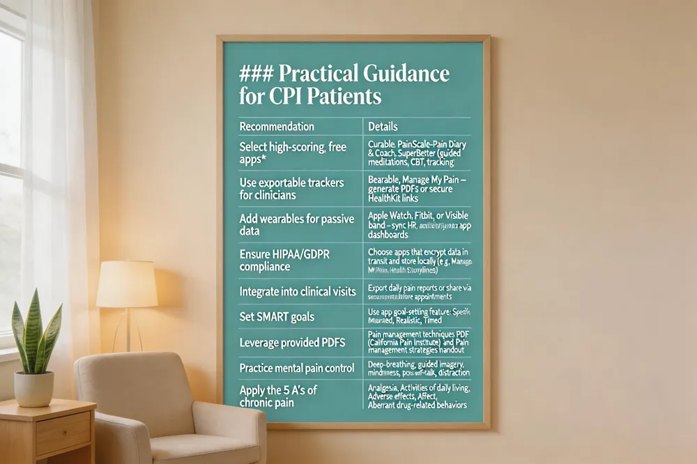 Los Angeles patients should start by choosing tools that match their specific condition and lifestyle. Free, high‑scoring apps such as Curable, PainScale‑Pain Diary, and SuperBetter offer guided meditation, CBT, and pain‑coach features, while paid options like Pathways Pain Relief add physiotherapy videos and yoga modules. Pair these apps with wearables that reliably record activity, heart‑rate variability, and sleep—Apple Watch, Fitbit, or the Visible band are popular choices that integrate directly into the apps. When a patient logs pain scores, medication use, and trigger data, the information can be exported securely (HIPAA‑compliant) and shared through patient portals or directly with the California Pain Institute’s team, enabling real‑time treatment adjustments. Finally, maintain self‑efficacy by setting SMART goals, practicing relaxation techniques, and reviewing progress reports to reinforce confidence in managing pain independently.
