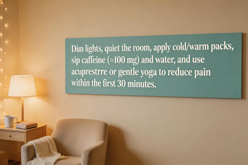 When a migraine begins, the fastest way to gain relief is to change your environment instantly. Dim the lights, close the curtains, and turn off noisy appliances; a dark, quiet room reduces sensory overload that intensifies pain. Apply a cold pack or ice wrap to the temples or neck for up to 15 minutes, or use a warm compress if muscle tension predominates. A small dose of caffeine—about 100 mg from coffee or tea—taken within the first half‑hour can enhance the effect of acute medication and constrict dilated vessels, but avoid excess to prevent rebound headaches. Hydration is essential; sip water or an electrolyte drink to correct mild dehydration, a common trigger. Simple physical actions such as gentle scalp massage, light yoga stretches, or pressing acupressure points (LI‑4 between thumb and index finger, GB‑20 at the base of the skull) can release tension and activate the relaxation response. If you tolerate it, an over‑the‑counter NSAID or acetaminophen may be taken according to physician guidance. Should pain persist beyond two hours, contact your headache specialist for further evaluation. Implementing these steps promptly can shorten attack duration and reduce the need for additional medication.