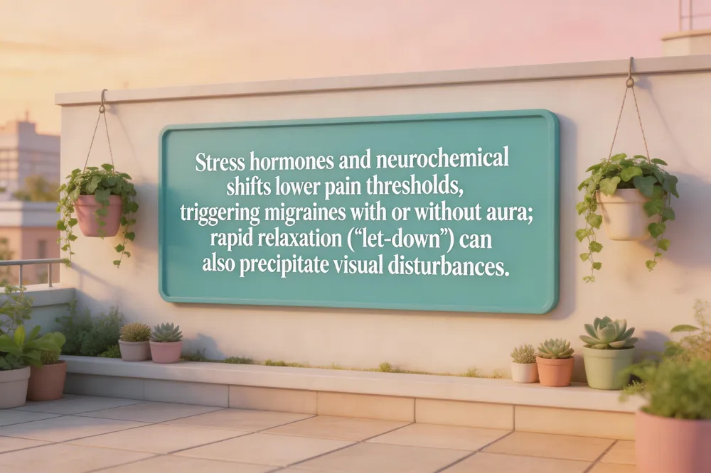 Stress activates hormonal and neurochemical pathways—especially cortisol, adrenaline, and serotonin fluctuations—that lower the brain’s pain threshold and can trigger migraine attacks, including those with aura. Both acute stress and the rapid relaxation that follows ("let‑down" migraines) may precipitate visual aura phenomena such as scintillating lights or zig‑zag patterns.