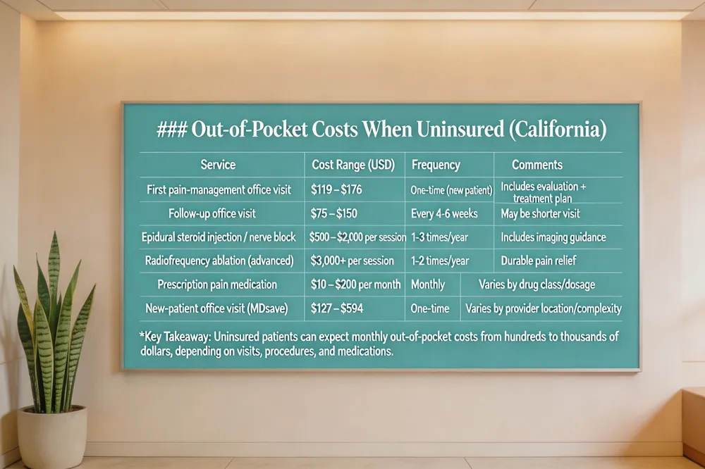 Standard office‑visit fees in California typically range from $119 to $176 for a first pain‑management appointment, with follow‑up visits often falling between $75 and $150. Procedural and interventional costs vary widely: a basic epidural steroid injection or nerve block may cost $500‑$2,000 per session, while more advanced services such as radiofrequency ablation can exceed $3,000. Prescription‑drug expenses add another $10‑$200 per month, depending on the medication and dosage.