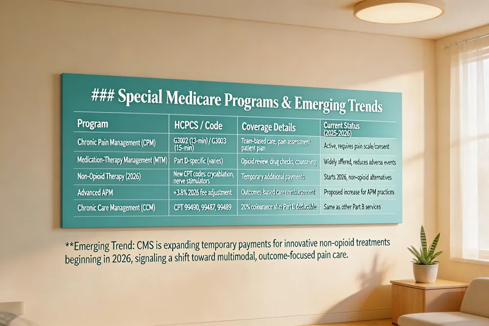 Emerging trends: CMS is adding temporary payments for non‑opioid therapies (e.g., cryoablation, peripheral nerve stimulators) beginning 2026, and the 2026 Medicare Physician Fee Schedule proposes a 3.8 % increase for practices in Advanced Alternative Payment Models, emphasizing outcomes over volume (details).