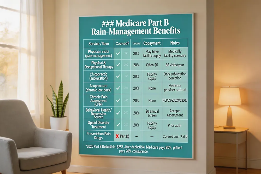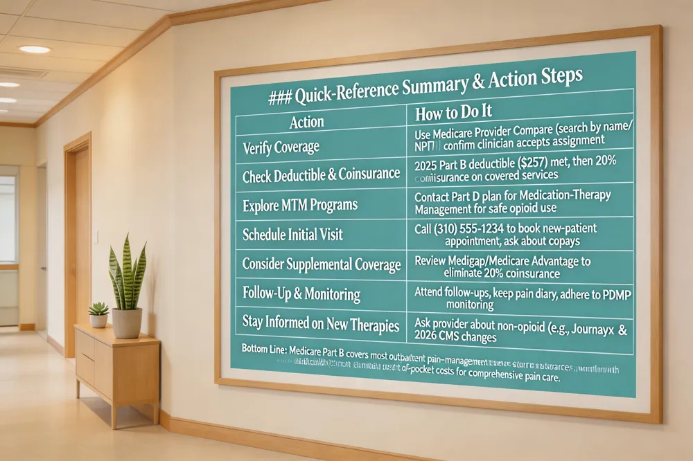 Medicare’s pain‑management benefits are centered on Part B outpatient services—physical and occupational therapy, acupuncture for chronic low‑back pain, chiropractic care (when correcting subluxation), behavioral‑health integration, depression screening, and chronic‑pain management bundles. After meeting the annual Part B deductible (≈ $257 in 2025), beneficiaries typically pay a 20 % coinsurance; hospital‑outpatient clinics may add a modest copayment https://www.medicare.gov/coverage/pain-management. Part D covers prescription pain medications and often includes Medication Therapy Management programs for safer opioid use. To confirm your personal coverage, use the official Medicare Provider Search tool or consult your health‑care provider’s billing office, and verify that the clinician accepts Medicare assignment. If you have supplemental Medigap or a Medicare Advantage plan, those policies may lower or eliminate the coinsurance https://www.medicalnewstoday.com/articles/does-medicare-cover-pain-management. Finally, schedule a detailed discussion with your pain‑care team—physician, therapist, and pharmacist—to create a tailored, evidence‑based plan that maximizes covered services while minimizing out‑of‑pocket expenses.
