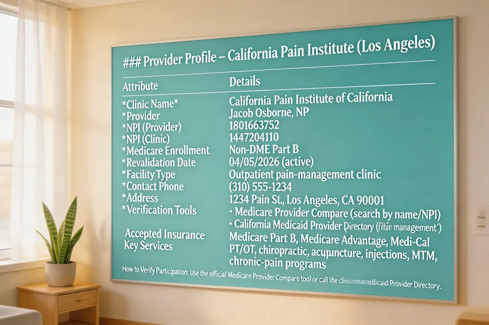 How to verify Medicare or Medicaid participation – Use the official Medicare Provider Compare tool (https://www.medicare.gov/physiciancompare) and search by the clinic’s name or NPI to confirm it accepts assignment. For Medicaid, visit the California Medicaid Provider Directory, enter the practice name or ZIP code, and filter for “pain management.” Call the office at (310) 555‑1234 to ask directly about your specific plan’s network status.